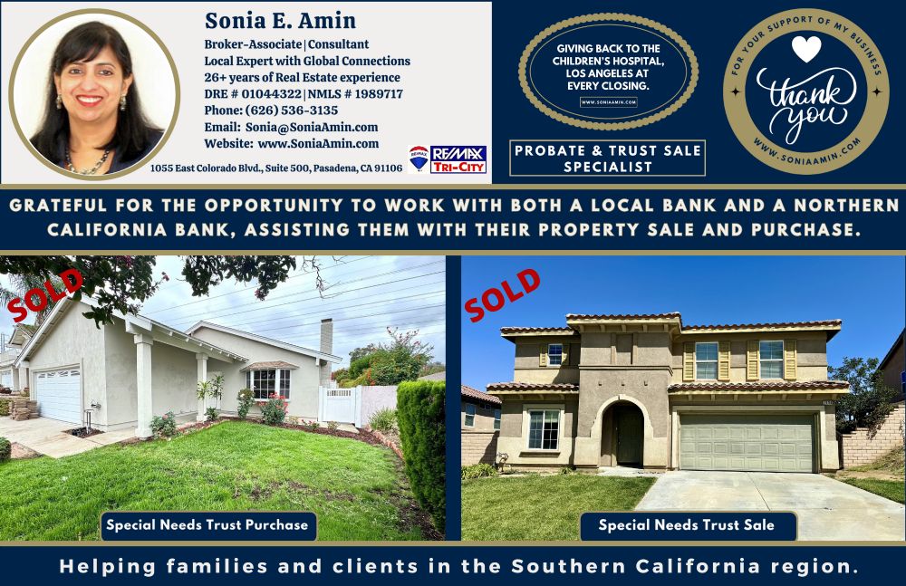 As a Certified Trust & Probate Sale Specialist, I had the privilege of assisting a Northern California bank with the purchase of a beautiful 4 bedroom home in Hacienda Heights for a Special Needs Trust Client. Thank you to the local Special Needs Trust Advisor for connecting me to the Bank Trust officer. I also represented a local bank in the successful Special Needs Trust sale of a property in Moreno Valley. If you or someone you know needs guidance with Trust, Probate, or Special Needs Trust real estate sale matters, I would be happy to be of assistance.